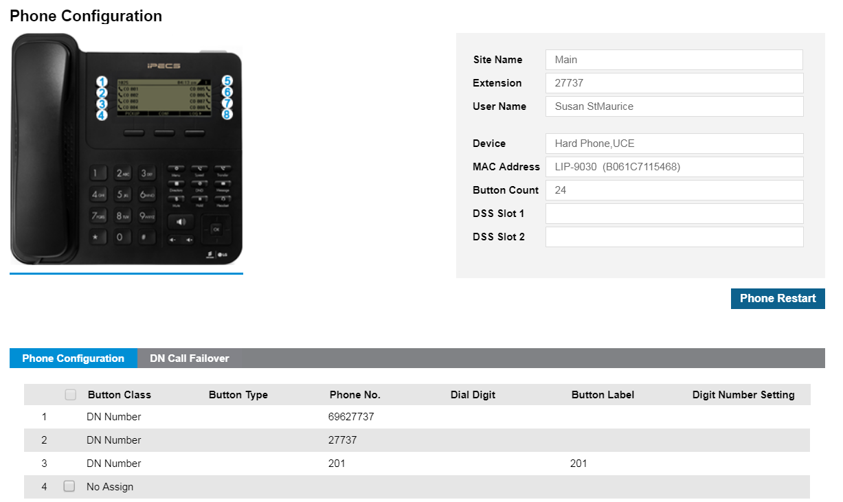 Phone Configuration displays information about your iPECS desktop phone. You can assign features to buttons on your phone here, and also restart your phone if necessary.
