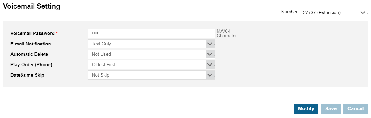 - Enter a new Voicemail Password (maximum 4 characters) and click Save.