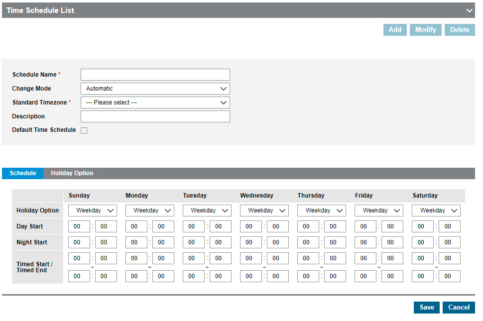 Enter the Day Start and Night Start times for each day, or set HOLIDAY for closed.