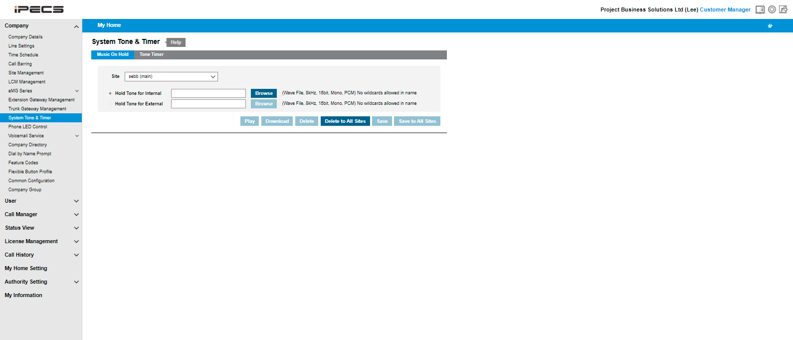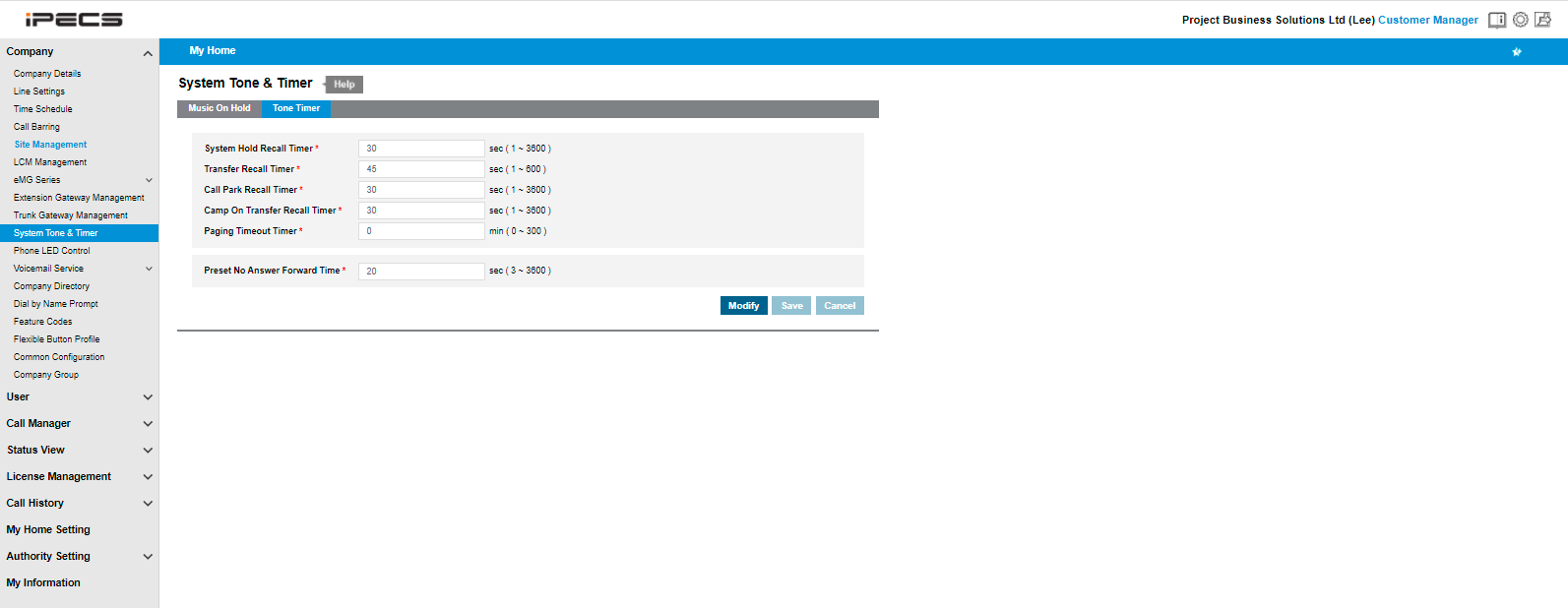 In this section, you can change the behaviour of your system when it is on hold (music on hold) and the timings of the in call features such as hold, transfer, call park, paging and pre-set no answer forward time.