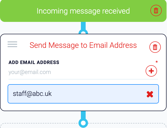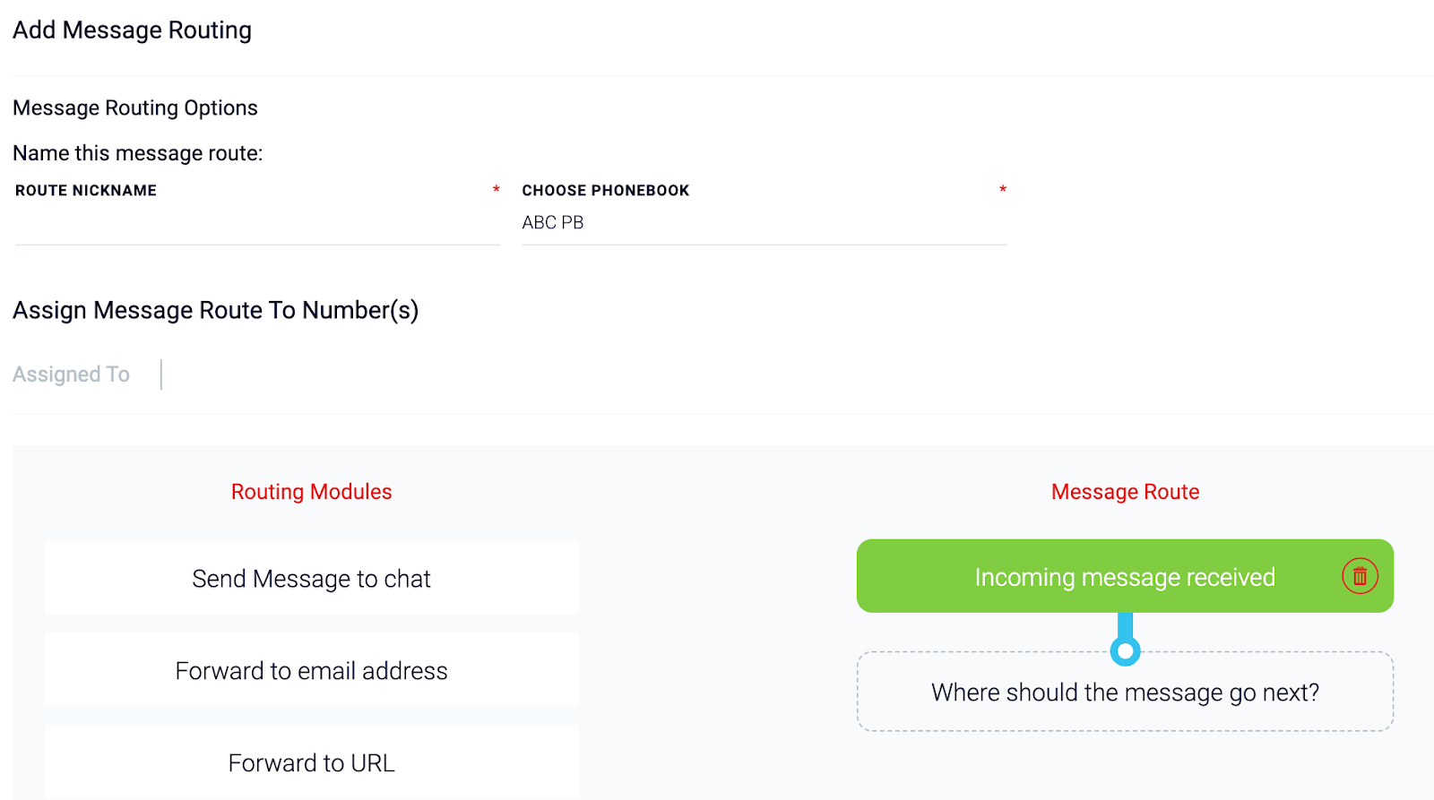Choose one of the four available routing modules by dragging a module from the left side of the screen to the right side, under Incoming Message Received.