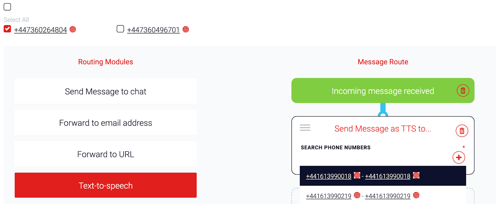 Alternatively, use the Text to Speech module and assign a number to the message route. When a message is received, the assigned number will be called, and the message will be read out using the Text to Speech feature. You can press 1 to repeat the message